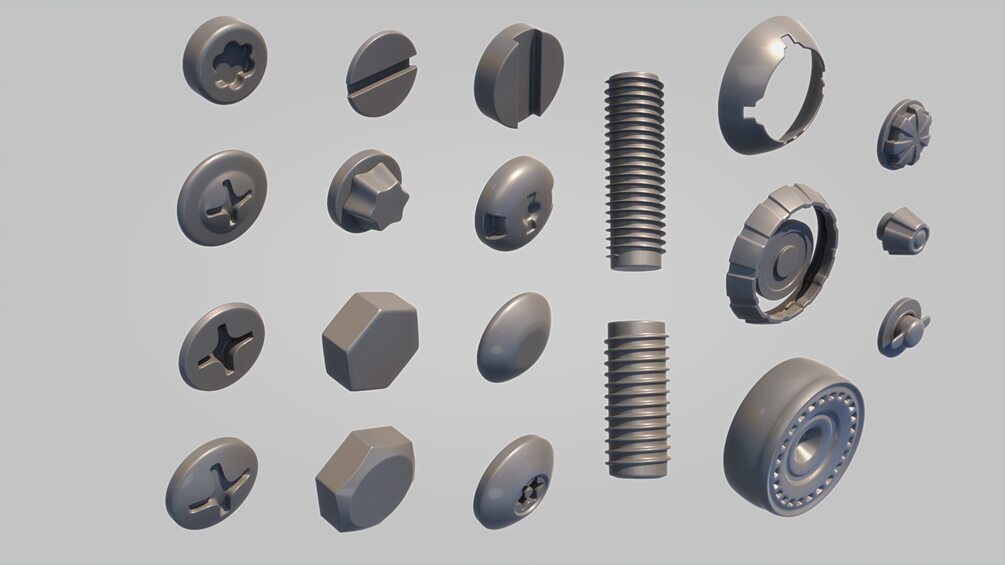 Screws, bolts, wheels and many types of subdividable forms which you can add or use in your hard surface mesh modeling.